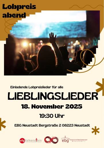 Lobpreisabend am 18.11.2025 Montag, 17. November 2025 Herzliche Einladung zum Lobpreisabend am 18.11.2025 ab 19.30 Uhr in der EBG in Neustadt, Bergstr. 2.